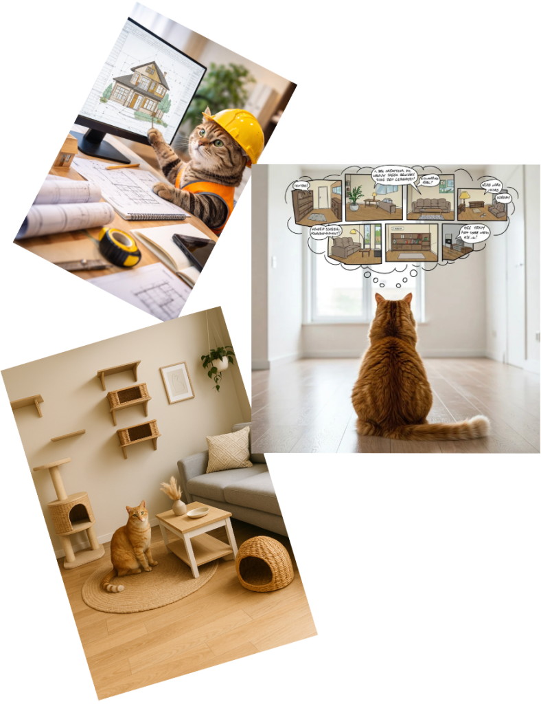 Lavoro con una lettura etologica dello spazio. Osservo: il gatto, le sue abitudini, le persone, i flussi quotidiani. Per costruire un ambiente che non sia un compromesso, ma un equilibrio.
